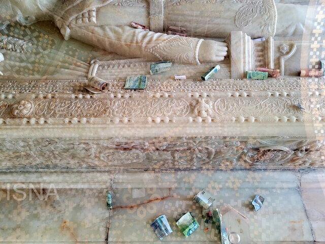 سنگ قبر ناصرالدین شاه که پیکرهای از او را به نقش کشیده است، در گوشهای از کاخ گلستان، معروف به «خلوت کریمخانی» نگهداری میشود. این سنگ در محفظهای شیشهای قرار داده شده که درون آن نیز اسکناسهایی انداخته شده است؛ صحنهای که البته چندان ناآشنا به نظر نمیآید، اما نه در کاخ گلستان و در تابوت شیشهای که از یک سنگ قبر با ارزشهای هنری و تاریخی محافظت میکند.