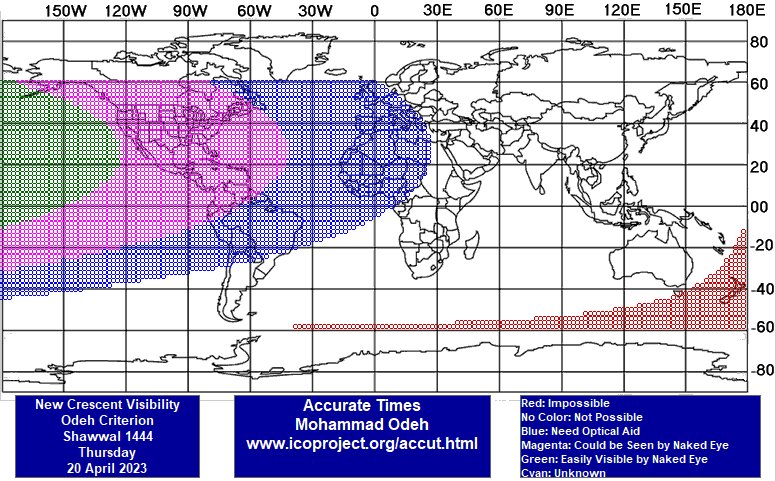 در مناطق سبز، هلال ماه با چشم غیرمسلح و در مناطق صورتی، هلال ماه احتمالا با چشم غیرمسلح دیده میشود.