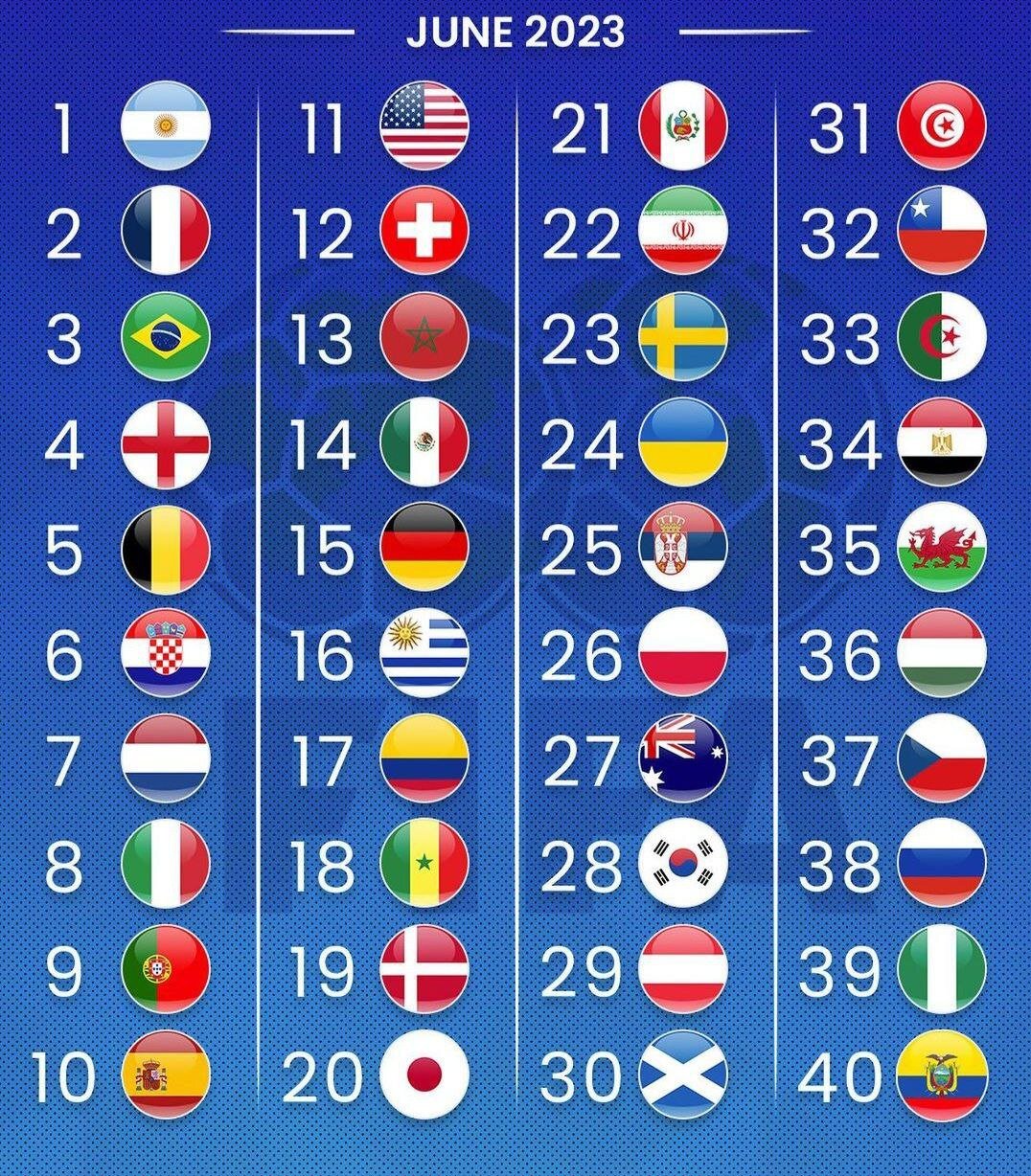 در ردهبندی ۱۰ تیم برتر جهان، آرژانتین همچنان صدرنشین است و جایگاه تیمهای برزیل و فرانسه هم دستنخورده باقی مانده است. انگلیس و کرواسی هر کدام یک پله صعود و بلژیک و هلند هم یک رتبه نزول کردهاند. رتبههای ایتالیا، پرتغال و اسپانیا هم تغییری نکرده است.