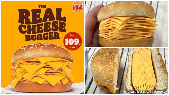 الهه جعفرزاده: اخیراً ساندویچی با معنای حقیقی کلمه «چیز برگر» با تأیید بهداشت در شعب رستوران «برگر کینگ» در سراسر تایلند به منو اضافه شد. این رستوران فستفود زنجیرهای در صفحات اجتماعی خود نوشت: «این یک شوخی نیست و واقعیت دارد.»