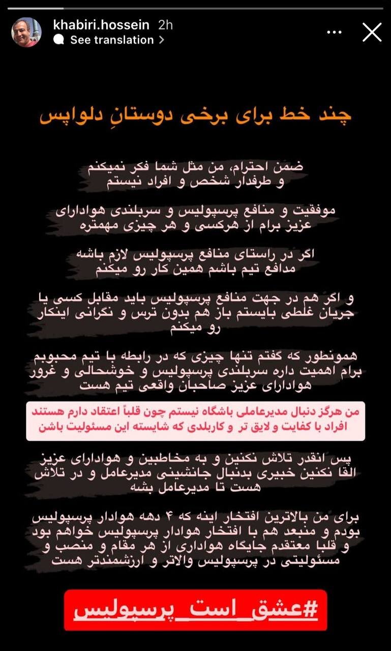 مدیریت باشگاه کادرفنی و بازیکنان را به دلیل نتایج ضعیف ۱۰ درصد جریمه کرد. همین موضوع باعث اعتصاب بازیکنان شد. در این بین برخی اعضای هیات مدیره باشگاه از جمله حسین خبیری مخالف تصمیم درویش بابت جریمه بازیکنان بودند و نسبت به این موضوع واکنش نشان دادند. حالا همین اختلاف نظر خبیری و درویش باعث شده تا شایعاتی مبنی بر حضور او در راس باشگاه شنیده شود. او با انتشار یک استوری به این حواشی واکنش نشان داد.