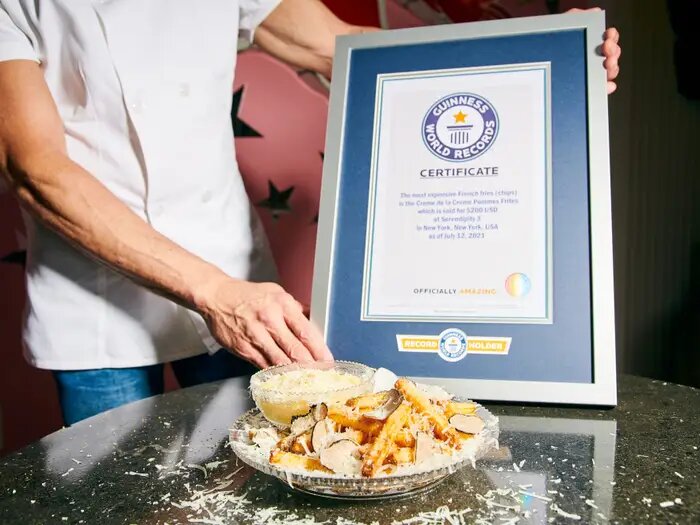 در نیویورک، یک بشقاب سیب زمینی سرخکرده با نام «Creme de la Creme Pommes Frites» با قیمت ۲۰۰ دلار (معادل ۱۰ میلیون تومان)، به عنوان یکی از گرانترین غذاهای جهان در کتاب رکوردهای گینس ثبت شده است. مواد استفادهشده در این غذای گرانبها شامل: سیب زمینی، شامپاین، سرکه و روغن مخصوص فرانسوی، نمک ترافل، پنیر، ترافل سیاه ایتالیایی و کره ترافل است. این سیب زمینی سرخکرده در یک بشقاب کریستالی سرو میشود، روی آن با پودر طلای خوراکی ۲۳ عیار تزئین میشود و ارزش آن را چندبرابر میکند.