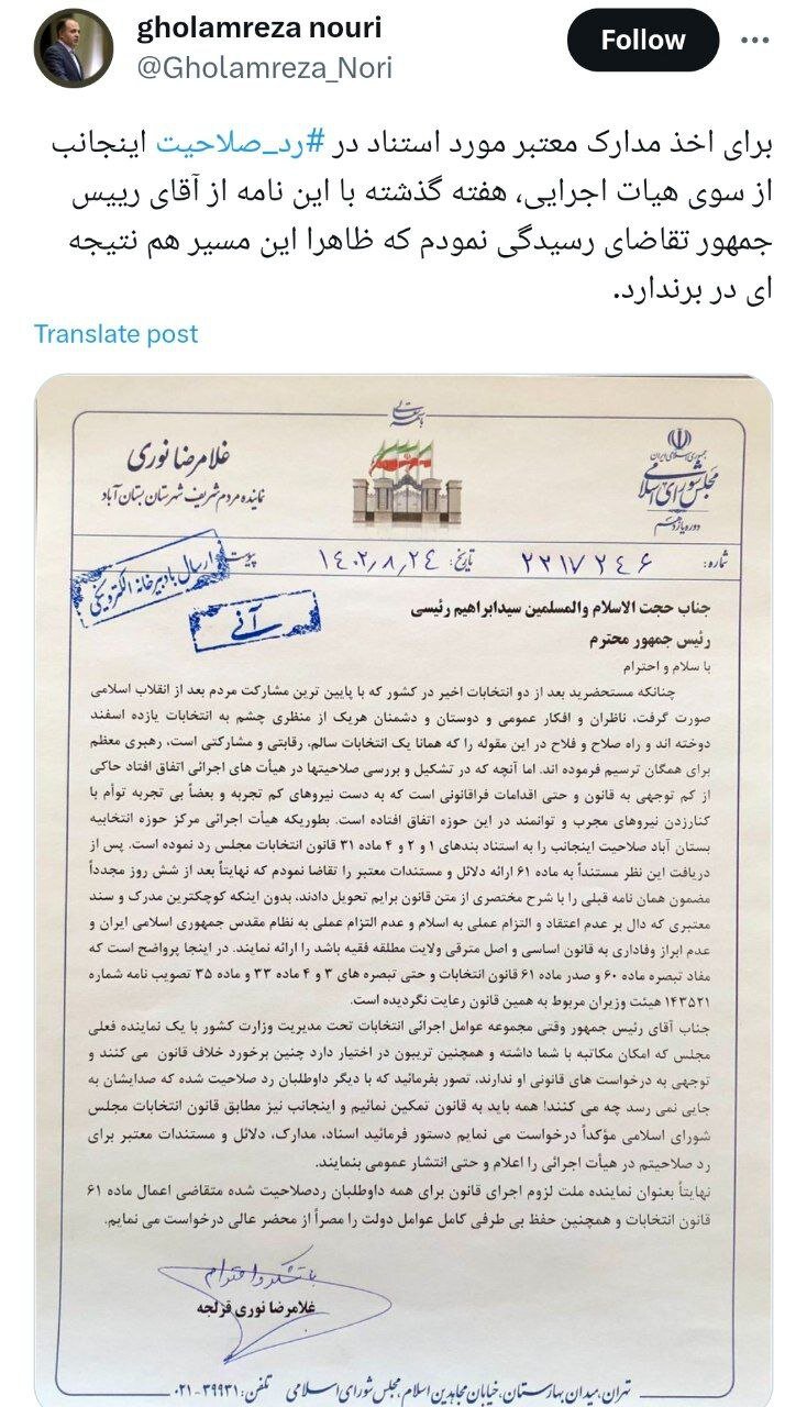 به گزارش خبرگزاری خبرآنلاین، غلامرضا نوری قزلجه، نماینده بستان آباد در مجلس در شبکه اجتماعی ایکس نوشت: رای اخذ مدارک معتبر مورد استناد در ردصلاحیت اینجانب از سوی هیات اجرایی، هفته گذشته با این نامه از آقای رییس جمهور تقاضای رسیدگی نمودم که ظاهرا این مسیر هم نتیجه ای در برندارد.