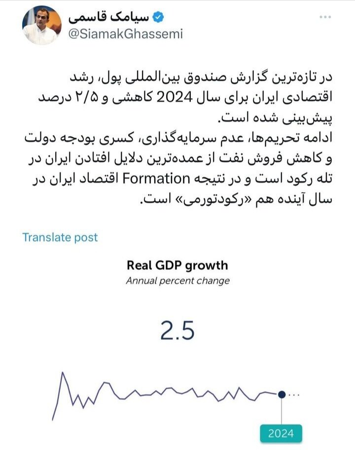 به گزارش خبرگزاری خبرآنلاین، سیامک قاسمی در یادداشتی در فضای مجازی نوشت: در تازهترین گزارش صندوق بینالمللی پول، رشد اقتصادی ایران برای سال ۲۰۲۴ کاهشی و ۲.۵ درصد پیشبینی شده است.