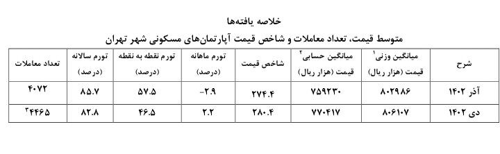 در دی ماه ۱۴۰۲ متوسط وزنی و حسابی قیمت آپارتمانهای مسکونی فروش رفته در شهر تهران به ترتیب به ۸۰ میلیون و ۶۱۰ هزار تومان و ۷۷ میلیون و ۴۱۷ هزار تومان رسیده است.