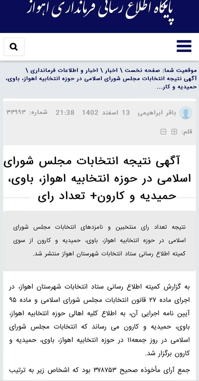 به گزارش خبرگزاری خبرآنلاین، سخنگوی وزارت کشور آرای ماخوذه صحیح در حوزه انتخابیه اهواز، باوی، حمیدیه و کارون را ۳۳۲.۷۸۰ اعلام کرده است (اینجا)، این در حالی است که طبق اعلام فرمانداری و ستاد انتخابات اهواز، جمع آرای مأخوذه صحیح ۳۷۸۷۵۳ است.