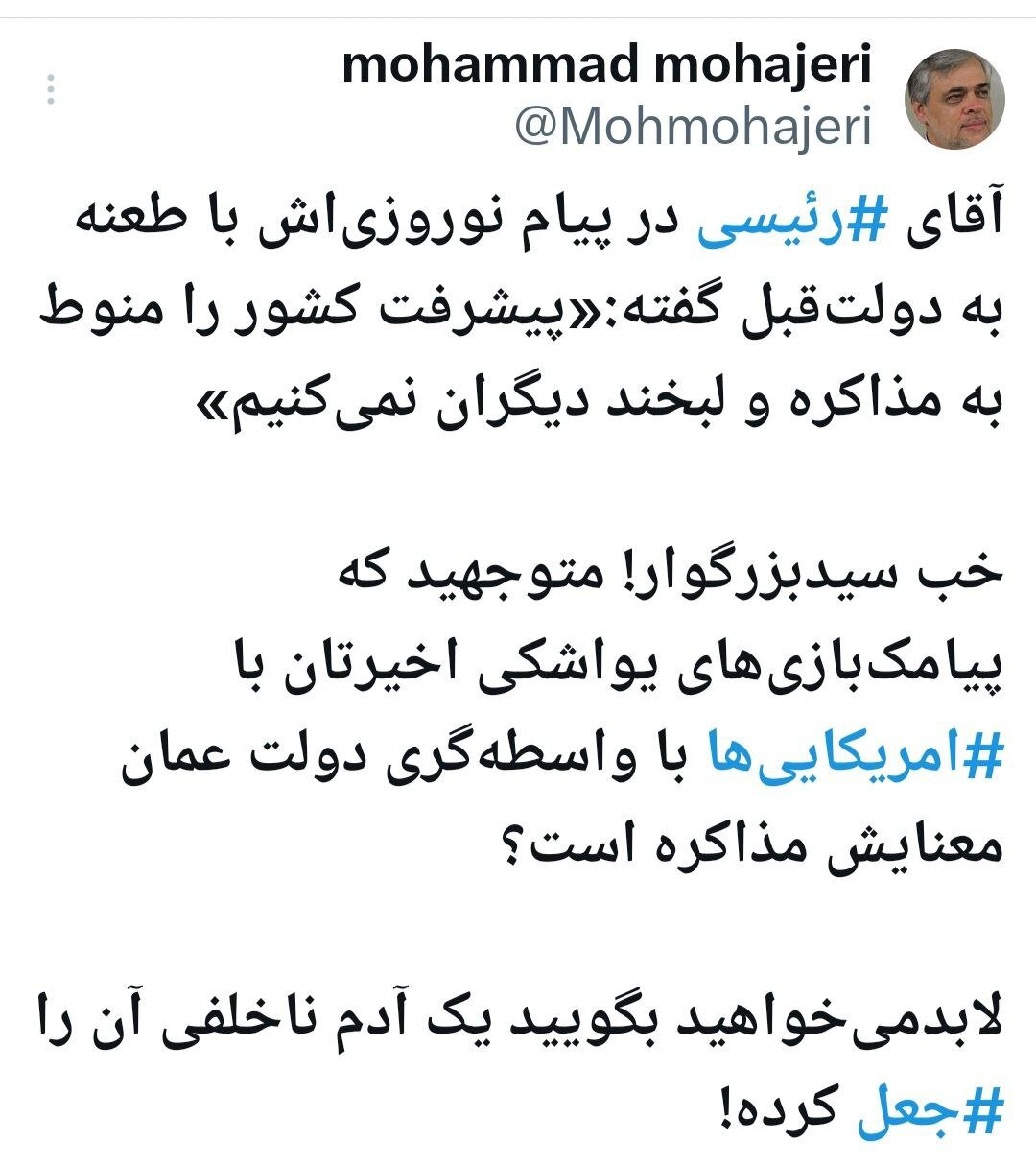 به گزارش خبرگزاری خبرآنلاین، محمد مهاجری، فعال سیاسی اصولگرا، در یادداشتی در شبکه اجتماعی ایکس در واکنش به پیام نوروزی رئیسی نوشت: