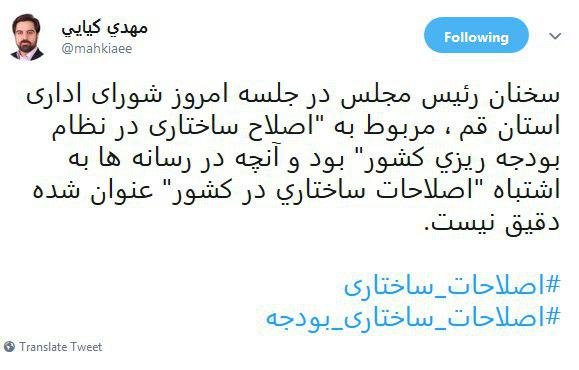 مهدی کیایی مدیرکل فرهنگی و روابط عمومی مجلس شورای اسلامی در پیامی توییتری در خصوص سخنان علی لاریجانی  در قم نوشته است که  سخنان علی لاریجانی مربوط به اصلاح ساختار بودجه‌ریزی در کشور است و تصور رسانه‌ها مبنی بر لزوم اصلاح ساختاری در کشور برداشت دقیقی نیست.
