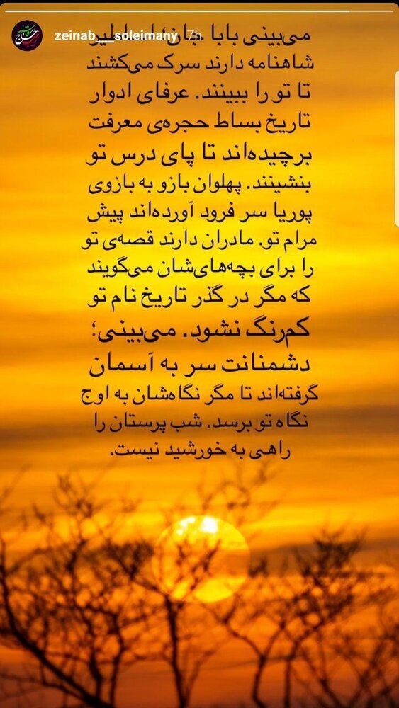 در ادامه تصویر و متن منتشر شده توسط زینب سلیمانی را مشاهده میکنید: