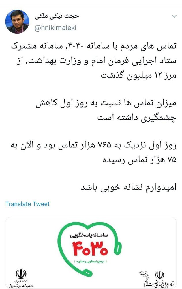 ملکی رئیس مرکز اطلاع رسانی ستاد اجرایی فرمان حضرت امام(ره) در صفحه توئیتر خود نوشت: «تماسهای مردم با سامانه ۴۰۳۰ سامانه مشترک ستاد اجرایی فرمان امام(ره) و وزارت بهداشت از مرز ۱۲ میلیون گذشت.