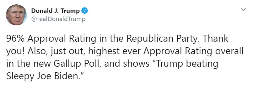 به گزارش خبرآنلاین، ترامپ در توئیتی نوشت: از مقبولیت ۹۶ درصدی در حزب جمهوریخواه برخوردارم که بیشترین میزان مقبولیت در نظرسنجی مؤسسه گلوپ بوده است و این نشان میدهد که ترامپ در انتخابات «جو بایدن» خواب آلود را شکست میدهد!