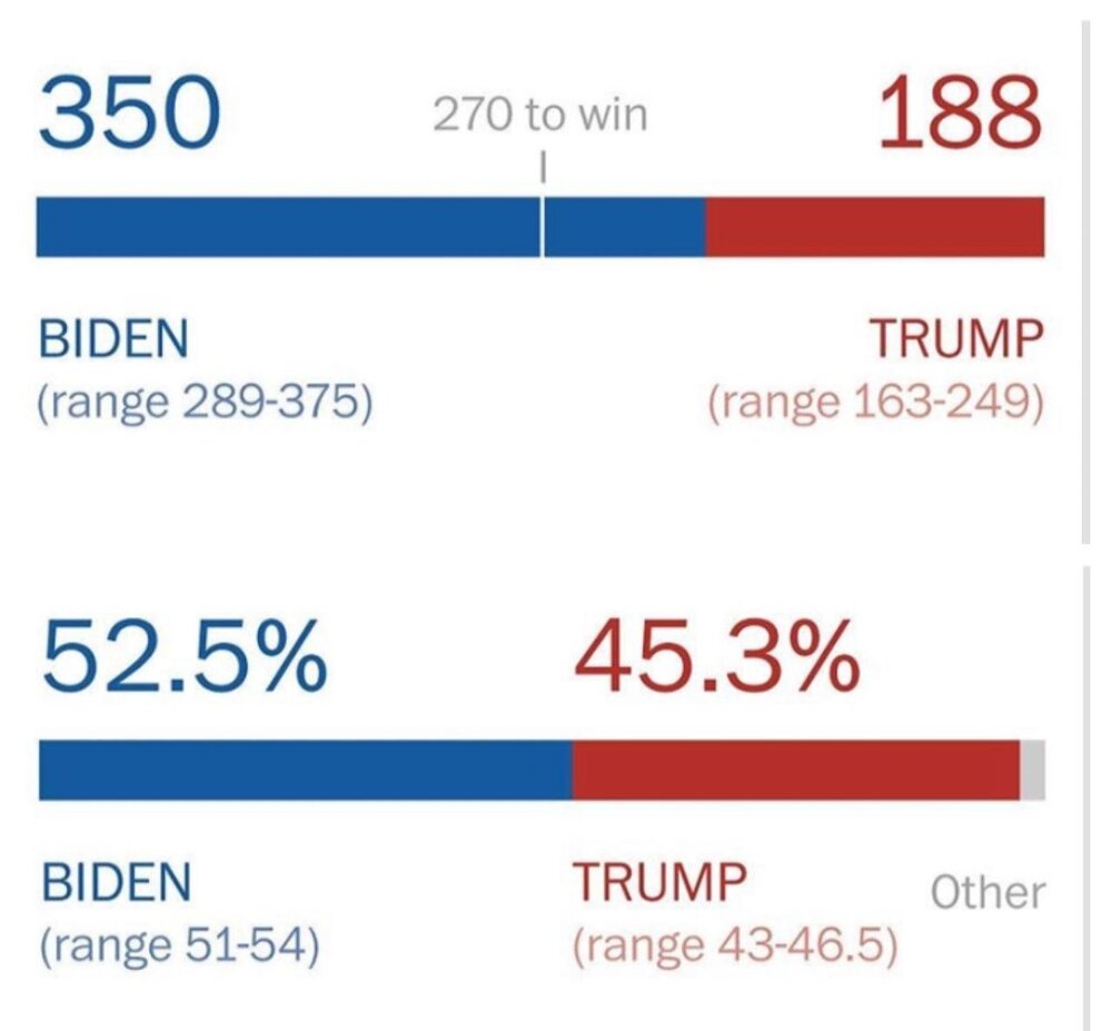 نمودار بالا مربوط به پیش بینی رای الکترال ترامپ و بایدن است و نمودار پایین رای مردمی ترامپ و بایدن را پیش بینی می کند.