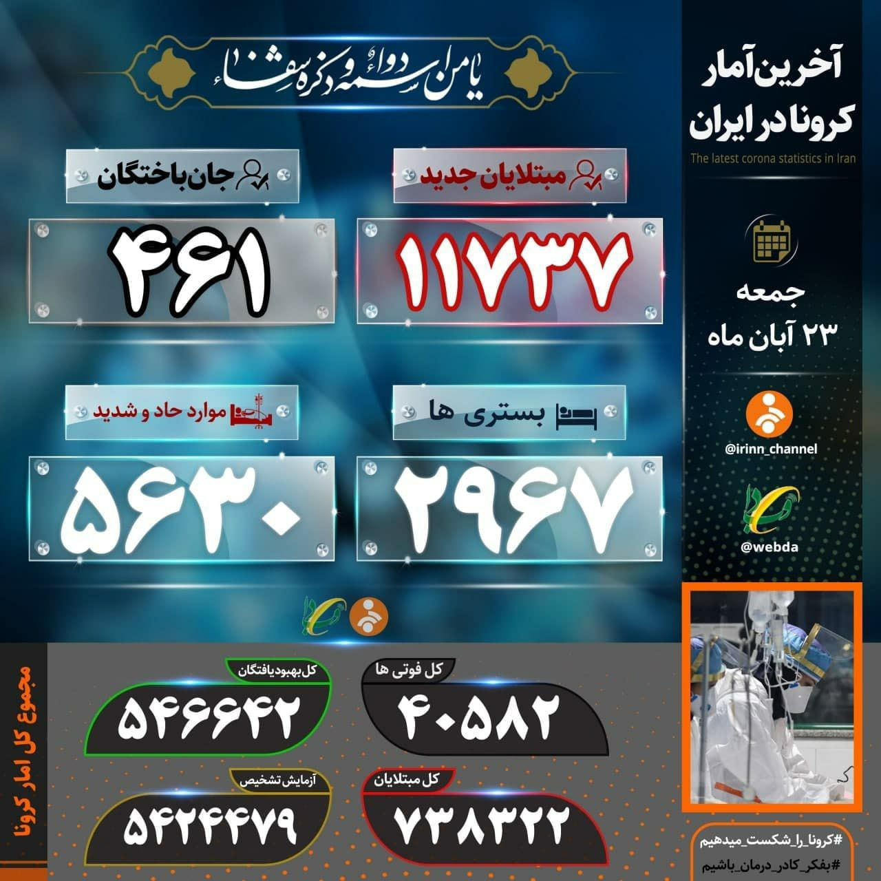 دکتر سیماسادات لاری گفت: از دیروز تا امروز ۲۳ آبان ۱۳۹۹ و بر اساس معیارهای قطعی تشخیصی، ۱۱ هزار و ۷۳۷ بیمار جدید مبتلا به کووید۱۹ در کشور شناسایی شد که دو هزار و ۹۶۷ نفر از آنها بستری شدند.