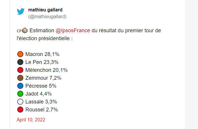 زمور یهودی ضد مهاجر با 7.2 درصد چهارم شد و بسیاری از طرفداران وی ممکن است آرای خود را به لوپن قرض دهند که در این صورت کار برای مکرون در دور دوم بسیار سخت خواهد شد.