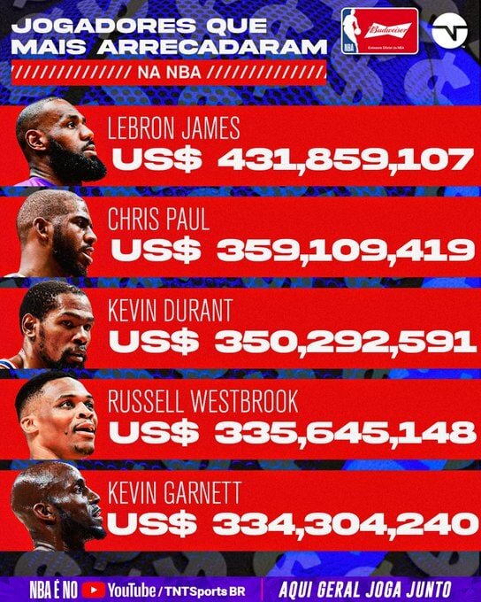 در لیست جدیدی که از ثروتمندترین ورزشکاران NBA منتشر شده، نام کینگ جیمز در رتبه نخست دیده میشود. دارایی او توسط TNT SPORTS میزان ۴۳۱.۸۵۹.۱۰۷ میلیون دلار اعلام شده است.