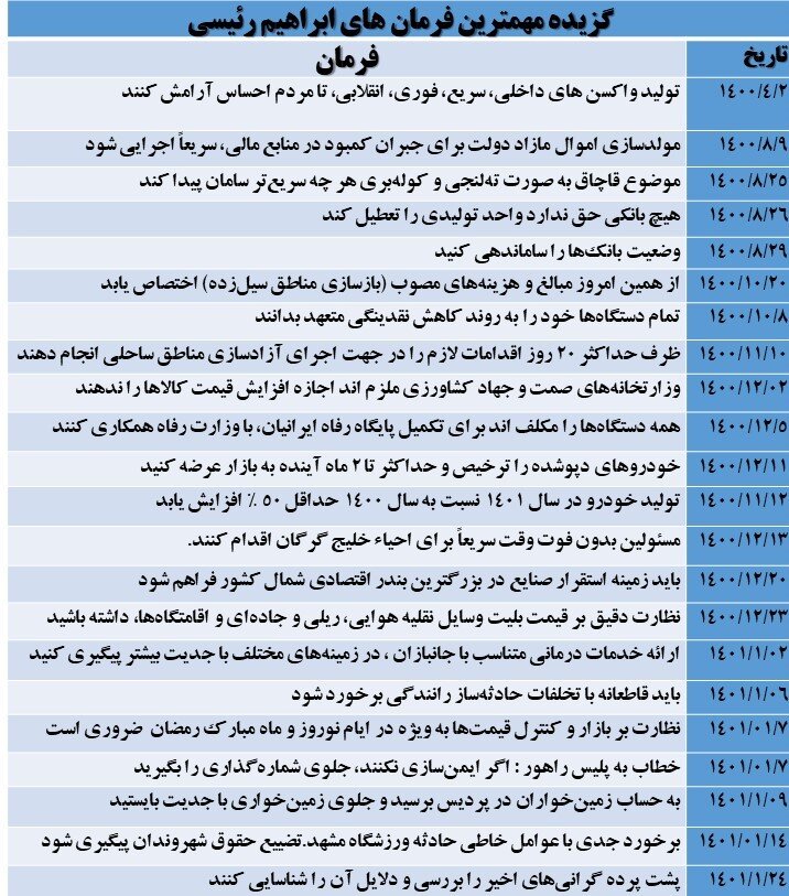 در نگاهی کلی ، یکی از ویژگی های رئیس دولت سیزدهم ، فرمان های پرشمار در موضوعات ریز و درشت است ، فرمان هایی که در اوایل آغاز به کار رئیسی ، جذابیت داشت و توجه افکارعمومی را به خود جلب می کرد اما به مرور زمان به دلیل تکراری شدن تیترهای «دستور رئیس جمهور...» از سویی و بی نتیجه ماندن فرمان ها حتی از جنس «سریع» ، از نقطه قوت به پاشنه آشیل رئیسی تبدیل شده است .