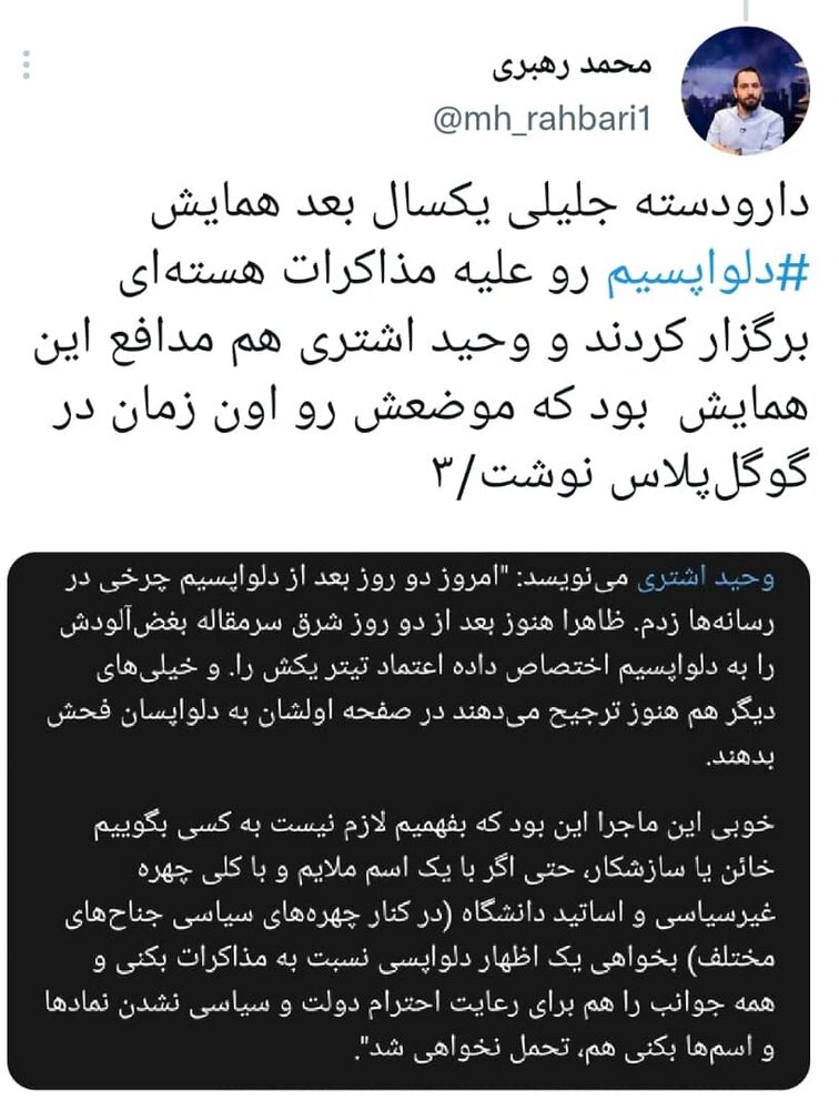 دارودسته جلیلی یکسال بعد همایش #دلواپسیم رو علیه مذاکرات هستهای برگزار کردند و وحید اشتری هم مدافع این همایش بود که موضعش رو اون زمان در گوگلپلاس نوشت/۳