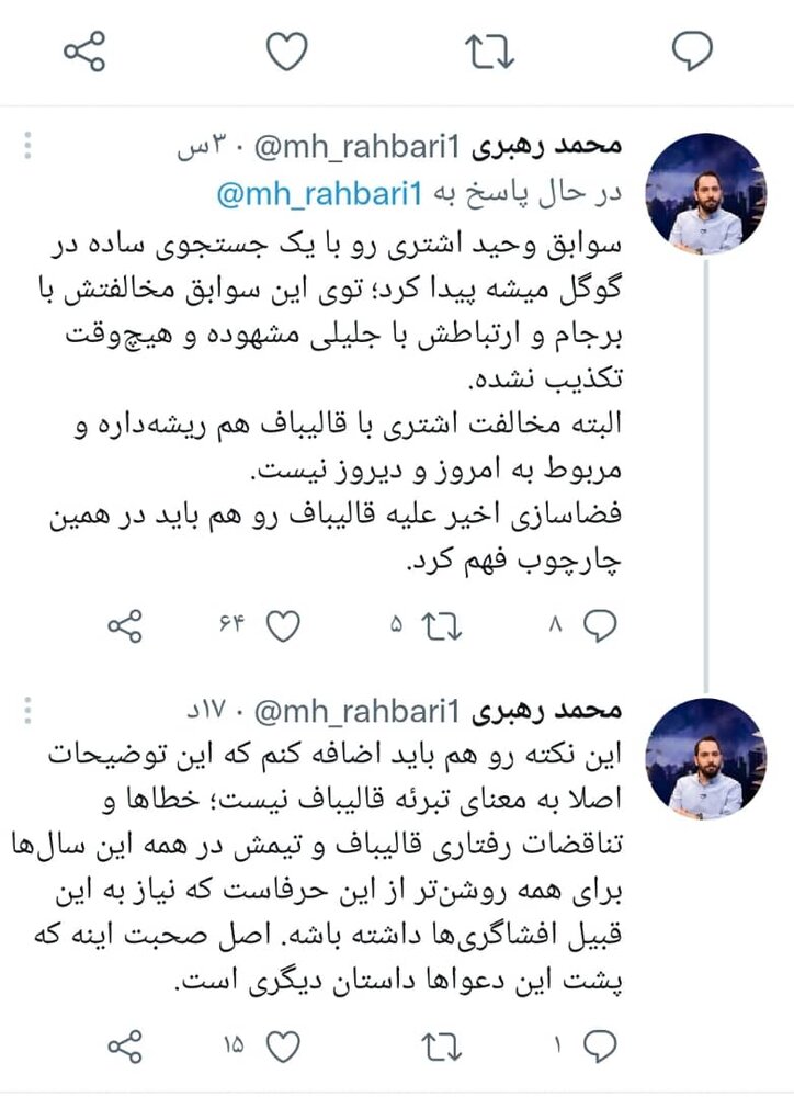 این نکته رو هم باید اضافه کنم که این توضیحات اصلا به معنای تبرئه قالیباف نیست؛ خطاها و تناقضات رفتاری قالیباف و تیمش در همه این سالها برای همه روشنتر از این حرفاست که نیاز به این قبیل افشاگریها داشته باشه. اصل صحبت اینه که پشت این دعواها داستان دیگری است.