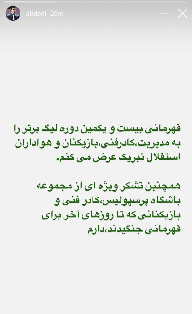 علی دایی اسطوره فوتبال ایران در استوری صفحه اینستاگرامش قهرمانی را به فرهاد مجیدی و شاگردانش تبریک گفت. او همچنین از اعضای باشگاه پرسپولیس به خاطر تلاشی که در این فصل داشتند تشکر کرد.