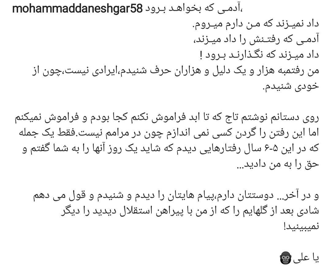 روی دستانم نوشتم تاج که تا ابد فراموش نکنم کجا بودم و فراموش نمیکنم اما این رفتن را گردن کسی نمی اندازم چون در مرامم نیست.فقط یک جمله که در این ۵-۶ سال رفتارهایی دیدم که شاید یک روز آنها را به شما گفتم و حق را به من دادید…