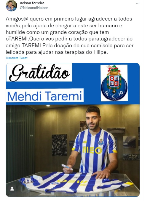 به گزارش خبرگزاری خبرآنلاین، نلسون فریرا یکی از هواداران تیم پورتو که پسری دارای معلولیت دارد از مهدی طارمی مهاجم پورتو درخواستکرده بود تا برای تأمین هزینههای درمان پسرش به او کمک کند.