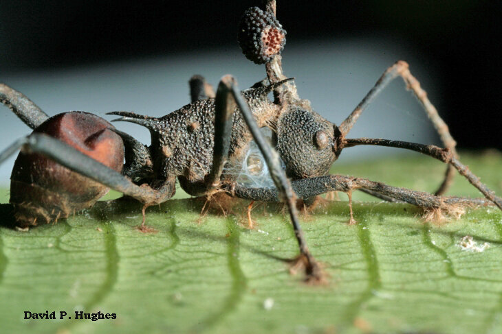 این مورچه زامبی هم رفتارش در اختیار قارچهایی درآمده که وادارش میکنند به جای مرتفعی، مثلا بالای درخت، برود تا کلاهک قارچ کله مورچه را بشکافدو هاگهایش را برای آلودهکردن قربانیان بعدی پراکنده کند.