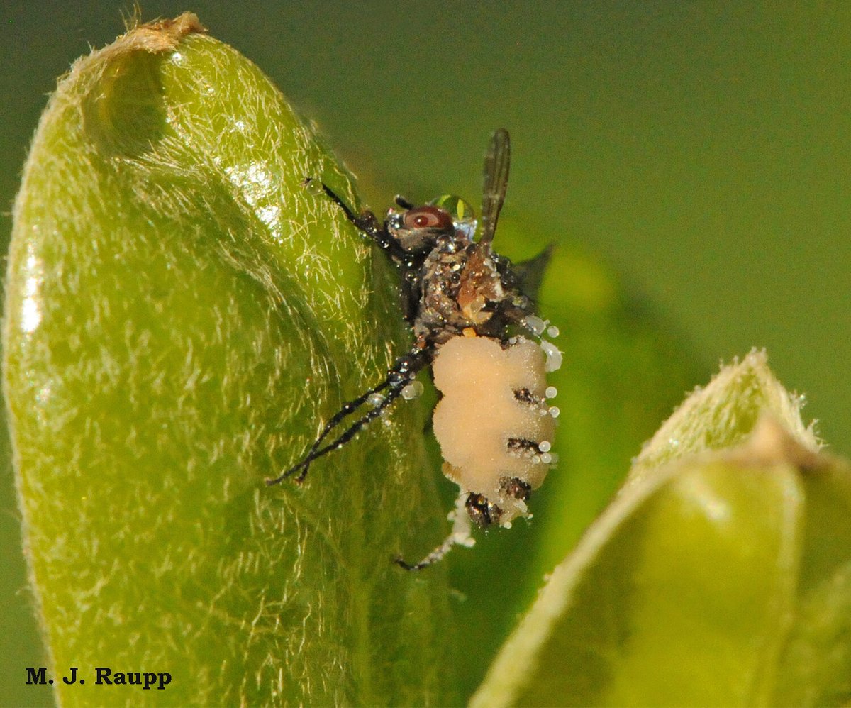 مگس لوبیایی هم وقتی با قارچ زامبیساز انتوموفتورا آلوده میشود، بالای ساقهای بلند میرود که در معرض دید باشد، شکمش برآمده میشود و برای مگسهای نر منظرهای شهوتانگیز میآفریند. هر مگسی که به امید شهوترانی به پشت مگس آلوده میرود، همین سرنوشت را خواهد داشت.
