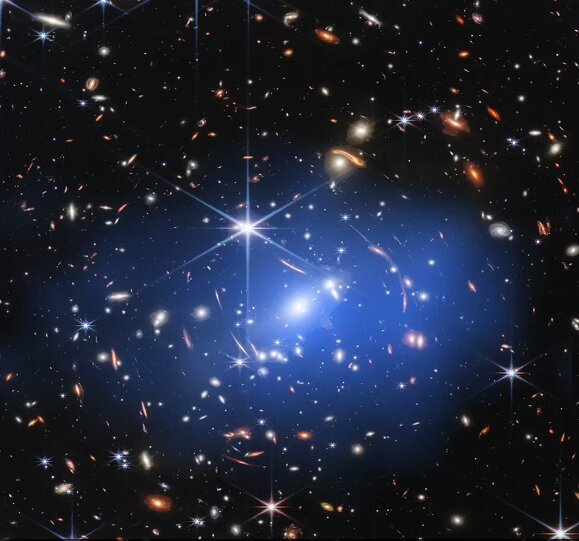 دادههای وب نشان میدهد که چگونه خوشه کهکشانی SMACS J۰۷۲۳ که در فاصله ۴.۲ میلیارد سال نوری از ما قرار دارد، شامل صدها کهکشان منفرد است. خوشههای کهکشانی به عنوان برخی از بزرگترین ساختارهای جهان، مملو از مخازن عظیمی از گاز فوق گرم هستند که فقط در نور پرتو ایکس دیده میشوند. در این تصویر، دادههای چاندرا به رنگ آبی گازی با دمای دهها میلیون درجه را نشان میدهد که جرم کلی آن حدود ۱۰۰ تریلیون برابر خورشید است، که چندین برابر جرم همه کهکشانهای این خوشه است. ماده تاریک نامرئی بخش بزرگتری از جرم کل خوشه را تشکیل میدهد.