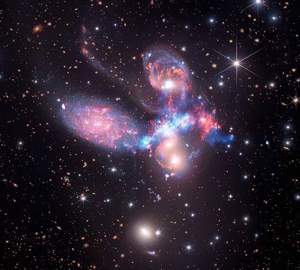 این مجموعه کهکشانی فشرده، در صورت فلکی اسب بالدار واقع شده و متشکل از پنج کهکشان است که چهار مورد از آنها به هم نزدیک هستند و انتظار میرود با یکدیگر ادغام شوند. تصویر وب که به رنگ قرمز، نارنجی، زرد، سبز و آبی دیده میشود، جزئیاتی را نشان میدهد که پیش از این هرگز دیده نشده بودند از جمله دمهای گازی و انفجارهای تشکیل ستارگان. دادههای چاندرا که به رنگ آبی روشن دیده میشوند از یک موج ضربهای پردهبرداری کردهاند که در آن گاز تا دهها میلیون درجه گرم میشود و یکی از کهکشانها با سرعت حدود دو میلیون مایل در ساعت از میان دیگر کهکشانها عبور میکند. این ترکیب جدید همچنین شامل دادههای فروسرخ از تلسکوپ فضایی اسپیتزر به رنگ قرمز، سبز و آبی نیز هست. تلسکوپی که اکنون بازنشسته شده است.
