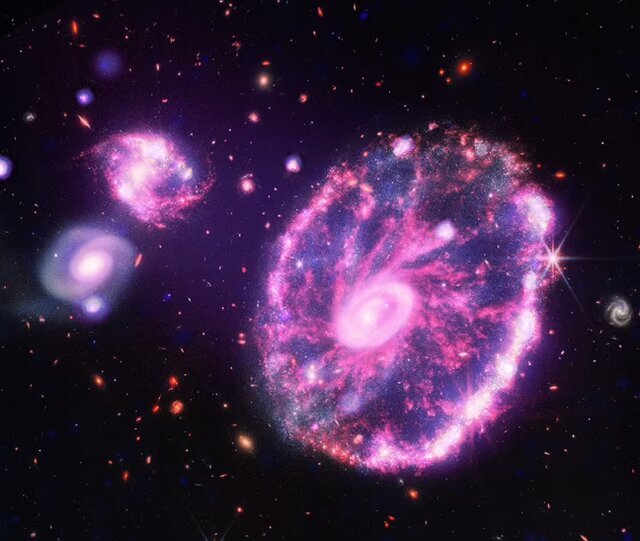کهکشان چرخگاری ظاهر خود را در نتیجهی برخورد با یک کهکشان کوچکتر دیگر که در خارج از میدان تصویر قرار دارد به دست آورده است. هنگامی که این کهکشان کوچکتر به چرخگاری برخورد کرد، باعث تشکیل ستارگانی شد که در اطراف یک حلقه بیرونی و در جاهای دیگر در سراسر کهکشان دیده میشوند. پرتوهای ایکسی که چاندرا به رنگ آبی و بنفش ثبت کرده از گازهای فوق گرم، ستارگان منفجر شده منفرد، و ستارههای نوترونی و سیاه چالههایی که مواد را از ستارگان اطراف به داخل خود میکشند، نشات گرفته است. نمای فروسرخ وب به رنگهای قرمز، نارنجی، زرد، سبز و آبی کهکشان چرخگاری را به همراه دو کهکشان کوچکتر در پس زمینهای از کهکشانهای دورتر نشان میدهد.