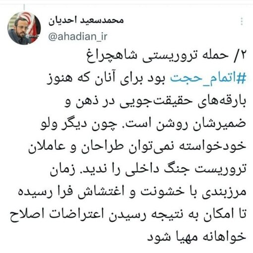 حمله تروریستی شاهچراغ اتمام حجت بود برای آنان که هنوز بارقههای حقیقتجویی در ذهن و ضمیرشان روشن است. چون دیگر ولو خودخواسته نمیتوان طراحان و عاملان تروریست جنگ داخلی را ندید. زمان مرزبندی با خشونت و اغتشاش فرا رسیده تا امکان به نتیجه رسیدن اعتراضات اصلاح خواهانه مهیا شود.
