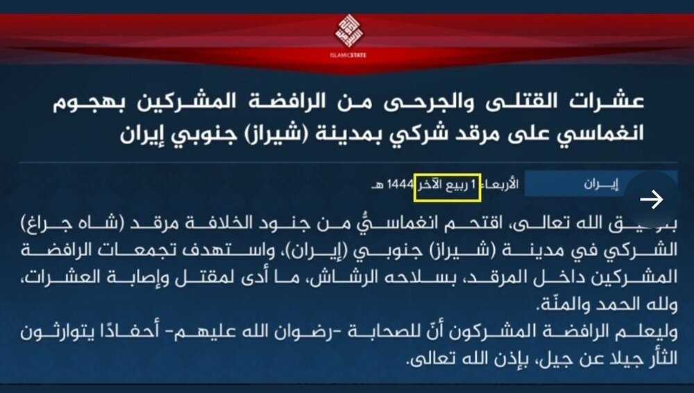 _ از شبهات دیگری که بدان استناد شده، پیام مجعول دیگریست مبنی بر اینکه "سربازان خلافت همزمان با چهلمین روز قتل مهسا امینی و در راستای گرفتن انتقام مظلومینی که توسط حکومت رافضیها در اعتراضات به این قتل کشته شدند، بوده است". مطلبی که در ارگان اصلی داعش النباء نیامده.