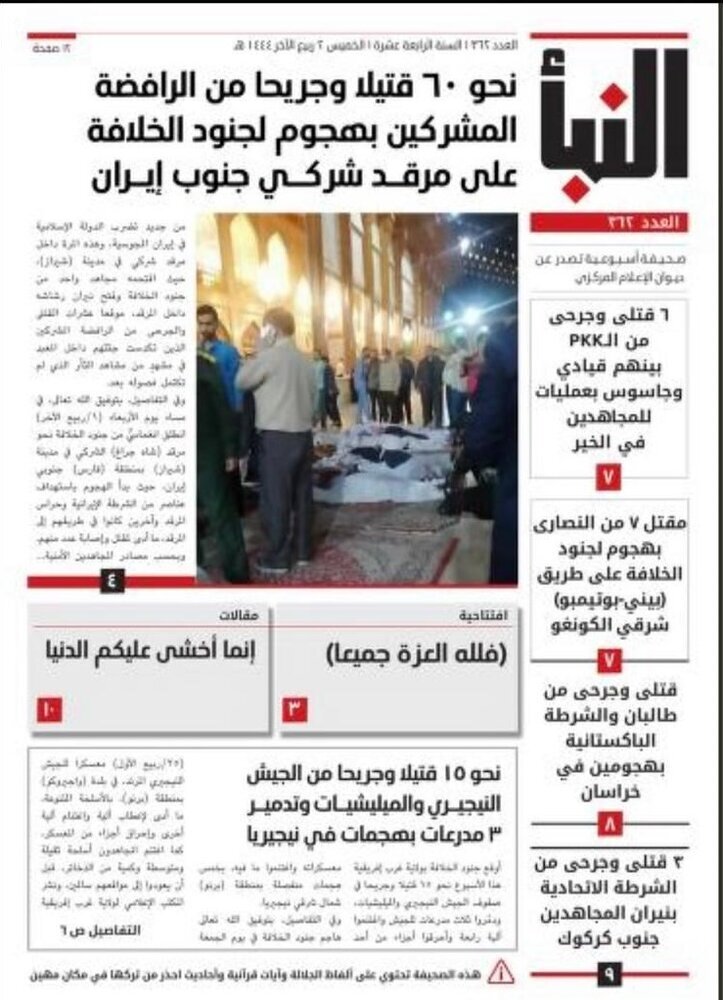 _ شماره جدید النباء که توسط دیوان رسانههای داعش منتشر میشود، به تفصیل از حمله خود به شاهچراغ شیراز نوشته است. پس از حمله داعش، رسانههای فارسی وابسته به دولتهای عربی_غربی و افرادی در شبکه های اجتماعی در انجام حمله و اطلاعیه داعش شبهه کردند. بتدریج به برخی شبهات پاسخ دهم.