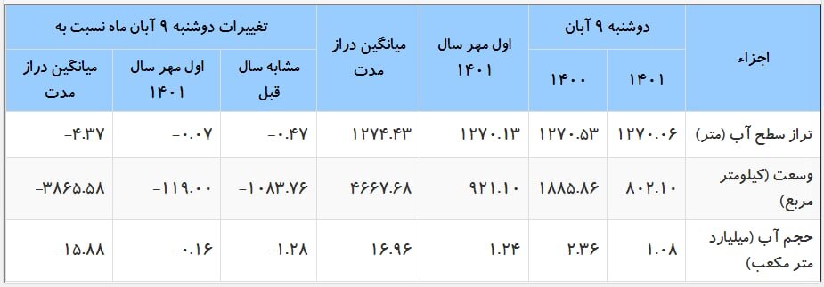 همچنین براساس این آمارها، حجم آب دریاچه ارومیه نسبت به ۱۷.۲۸ میلیارد مترمکعب در زمان اکولوژیک، بیش از ۱۶.۱۸ میلیارد مترمکعب /حدود ۹۴درصد/ کمتر شده است.