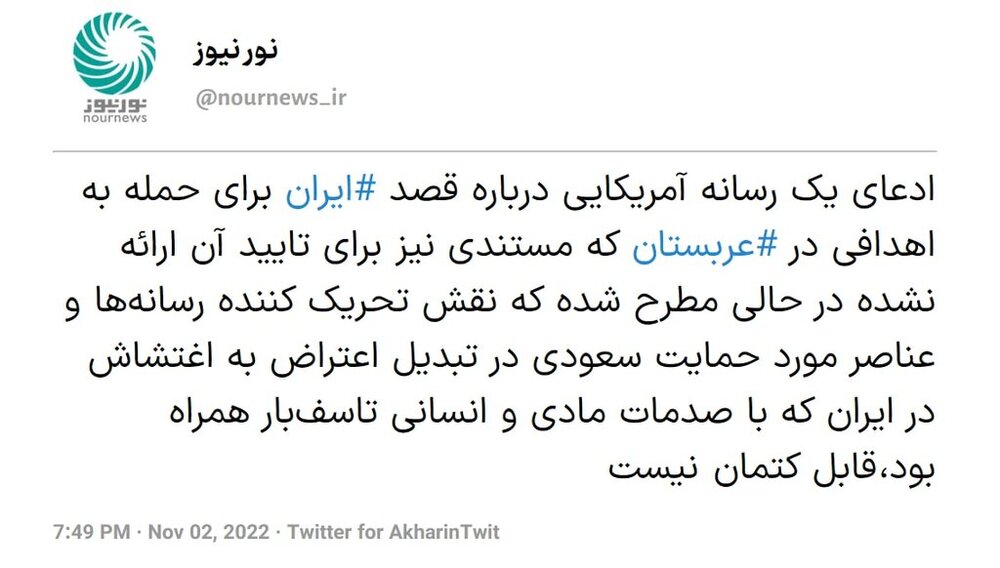 ادعای یک رسانه آمریکایی درباره قصد ایران برای حمله به اهدافی در عربستان که مستندی نیز برای تایید آن ارائه نشده در حالی مطرح شده که نقش تحریک کننده رسانهها و عناصر مورد حمایت سعودی در تبدیل اعتراض به اغتشاش در ایران که با صدمات مادی و انسانی تاسفبار همراه بود، قابل کتمان نیست.