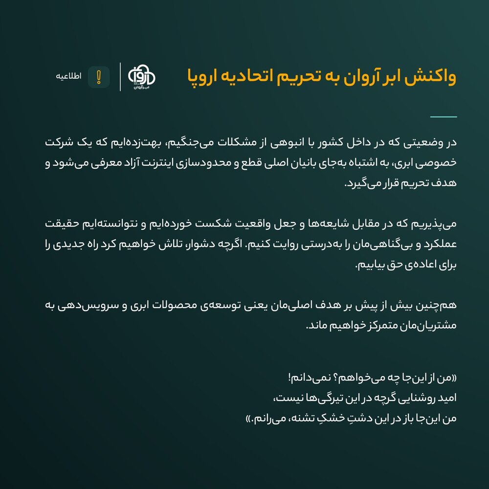 ابر آروان در واکنش به تحریم اتحادیه اروپا اعلام کرد: «امروز انتشار خبر تحریم آروانکلاد از سوی اتحادیهی اروپا در حالی اعلام شد که چند ماهی است با ارایه دلایلی فنی و روشن، اتهامات واهی و ادعاهای بیاساس مبنیبر نقش داشتن در محدودیت یا قطع اینترنت را بارها رد کردهایم.