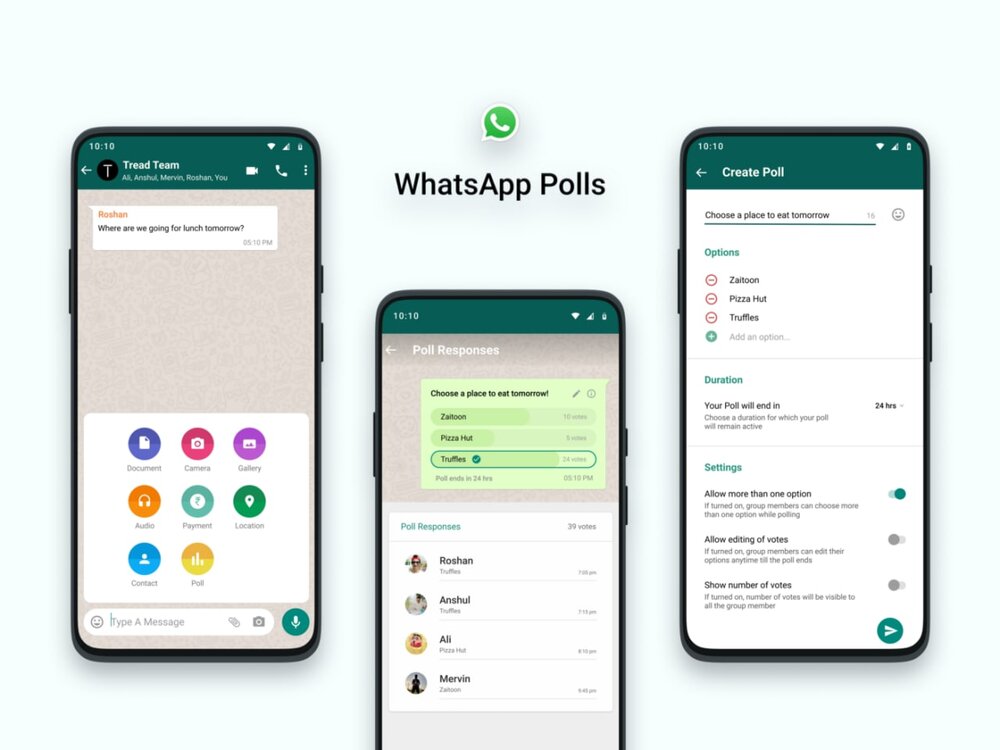 نسخه پایدار اپلیکیشن واتساپ اکنون دارای ویژگی نظرسنجی است که قبلاً فقط در نسخه بتا وجود داشت. با این وجود، اکنون در چتهای گروهی و مکالمات شخصی کاربران میتوانند از این ویژگی استفاده کنند. درباره عملکرد این ویژگی، تا ۱۲ گزینه را میتوان در آن گنجاند، به این معنی که یک نظرسنجی میتواند ۱۲ پاسخ مختلف داشته باشد. همچنین ایجاد نظرسنجی فقط در صورتی امکان پذیر است که حداقل دو گزینه وجود داشته باشد.