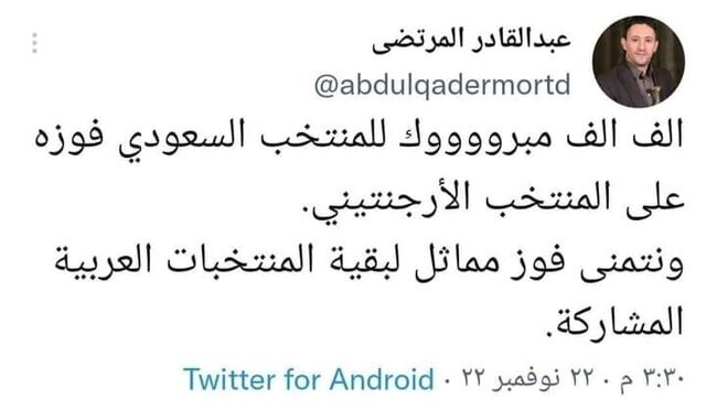 عبدالقادر المرتضی، رئیس کمیته اسرا در جنبش انصارالله یمن نیز پیروزی عربستان بر آرژانتین را تبریک گفت و ابراز امیدواری کرد که بقیه تیمهای ملی کشورهای عربی نیز در جام جهانی فوتبال بتوانند بر رقبایشان پیروز شوند.