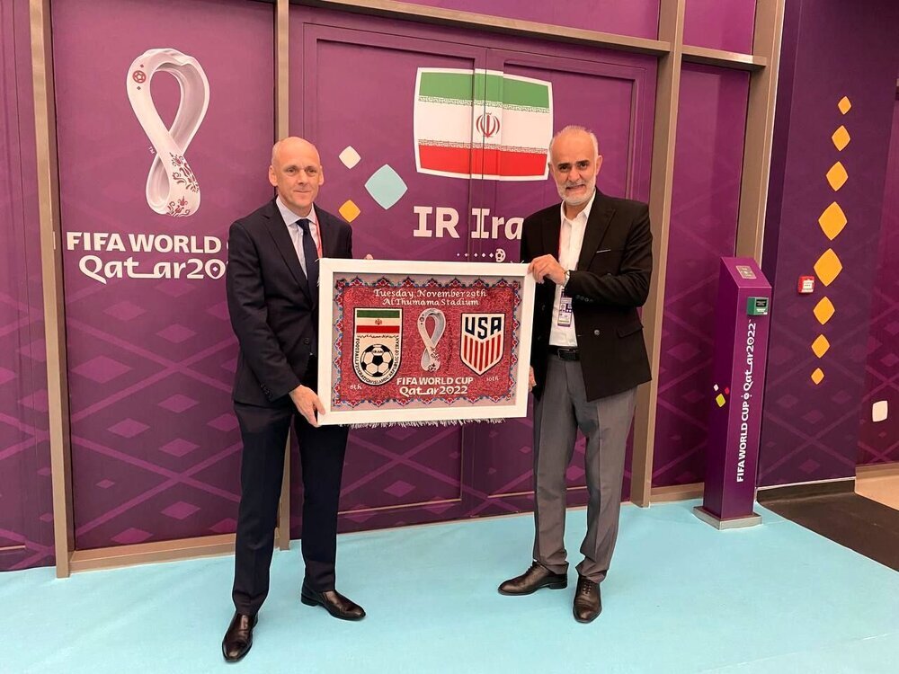 عکس منتشر شده در اعتمادآنلاین مربوط به اهدای فرش ویژه بازی ایران و آمریکا توسط سرپرست تیم ملی ایران به مدیر تیم ایالات متحده نشان صلح در میدان ورزش است.