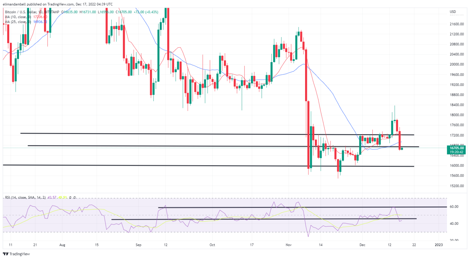با نگاهی به نمودار، بیت کوین به زیر نقطه حمایت کلیدی ۱۶۷۰۰ دلار سقوط کرد و به پایین ترین حد خود از ۳۰ نوامبر در این روند رسید؛ با اینوجود قیمتها از آن زمان بازگشتند، زیرا شاخص قدرت نسبی ۱۴ روزه (RSI) از کف ۴۲.۲۰ جهش کرد و در حال حاضر در ۴۳.۵۲ دنبال میشود.