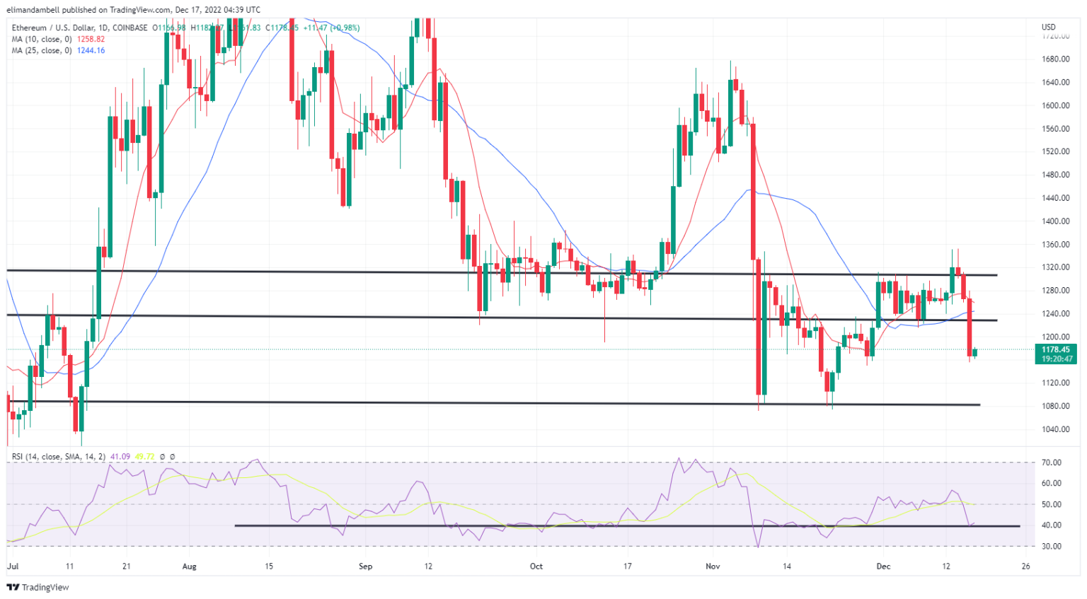 مانند BTC، کاهش روز گذشته باعث میشود که ETH همچنان به پایینترین حد پنج هفتهای (۱۱۵۰ دلار) معامله شود و RSI نیز نزدیک به کف چند هفتهای است.