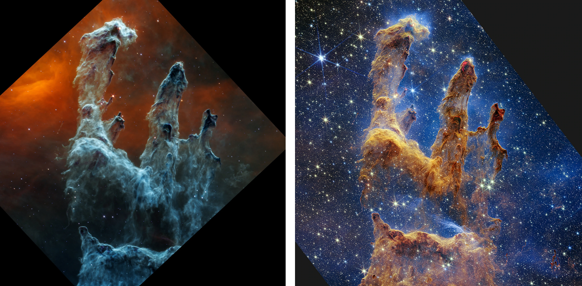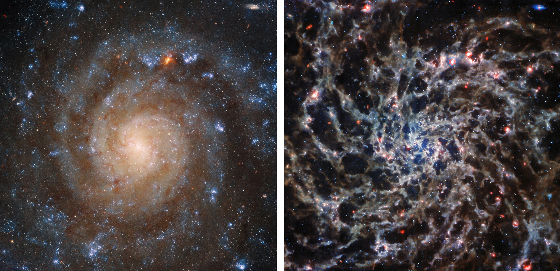 در تصویر سمت چپ ساختار مارپیچی پیچ در پیچ کهکشان IC ۵۳۳۲ در نور ماوراء بنفش و مرئی که توسط تلسکوپ فضایی هابل گرفته شده است آشکار می شود. به نظر می رسد مناطق تاریک و غبارآلود بازوهای مارپیچی را از هم جدا می کنند و در تصویر سمت راست که با استفاده از ابزار مادون قرمز میانی Webb (MIRI)، گرفته شدهاست، همان مناطق گرد و غباری دیگر تاریک نیستند. جیمز وب قادر است از میان گرد و غبار نگاه کند و "استخوان های" کهکشان را ببیند.