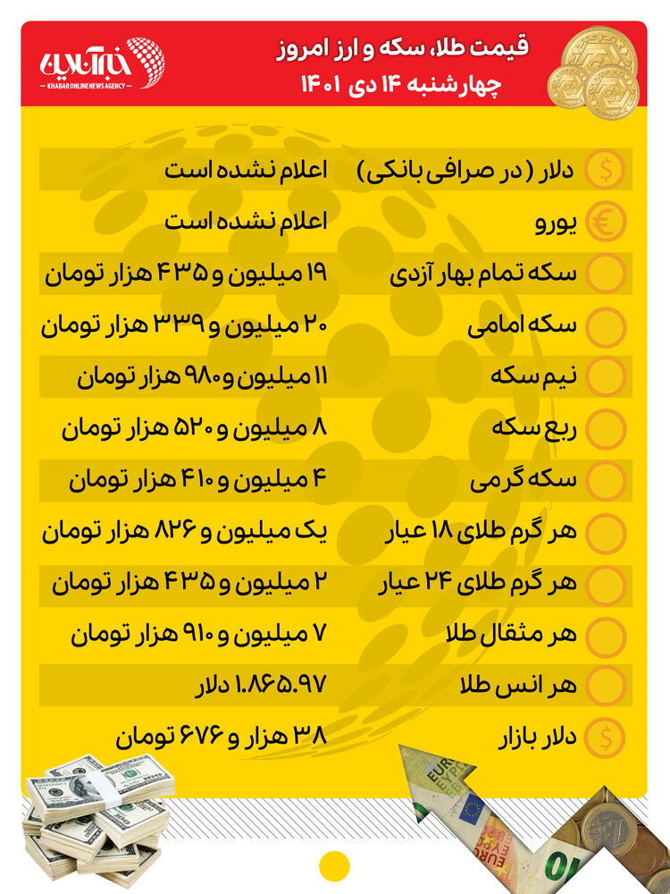 قیمت انواع ارز و سکه و طلا را در روز شنبه، هفدهم دیماه ۱۴۰۱ را مشاهده می کنید.
