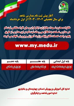 وی افزود: مهلت مقرر برای پیش ثبت نام پایه دهم مدارس شاهد نیز از اول لغایت بیستم تیرماه سال جاری میباشد.