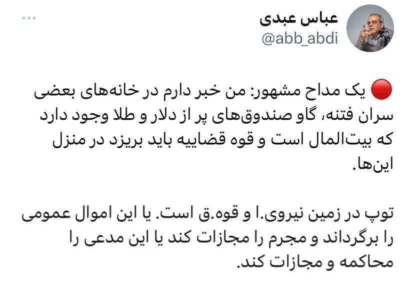 عباس عبدی در توئیتی به ادعای منصور ارضی مبنی بر وجود طلا و دلار در خانه برخی از سران فتنه واکنش نشان داد و نوشت :