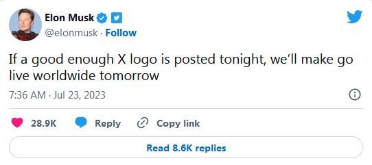 این میلیاردر ساعت ۱۲ و شش دقیقه صبح روز یکشنبه به وقت کرانه شرقی، در توییت دیگری اعلام کرد: اگر یک لوگوی ایکس به اندازه کافی خوب، امشب ارسال شود، فردا آن را در سطح جهانی به کار میبریم.