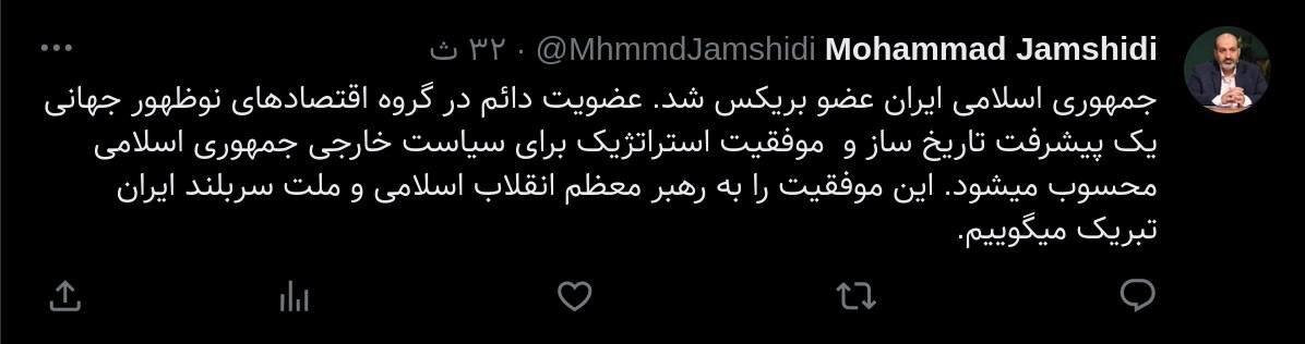 جمهوری اسلامی ایران عضو بریکس شد. عضویت دائم در گروه اقتصادهای نوظهور جهانی یک پیشرفت تاریخ ساز و موفقیت استراتژیک برای سیاست خارجی جمهوری اسلامی محسوب میشود. این موفقیت را به رهبر معظم انقلاب اسلامی و ملت سربلند ایران تبریک میگوییم.