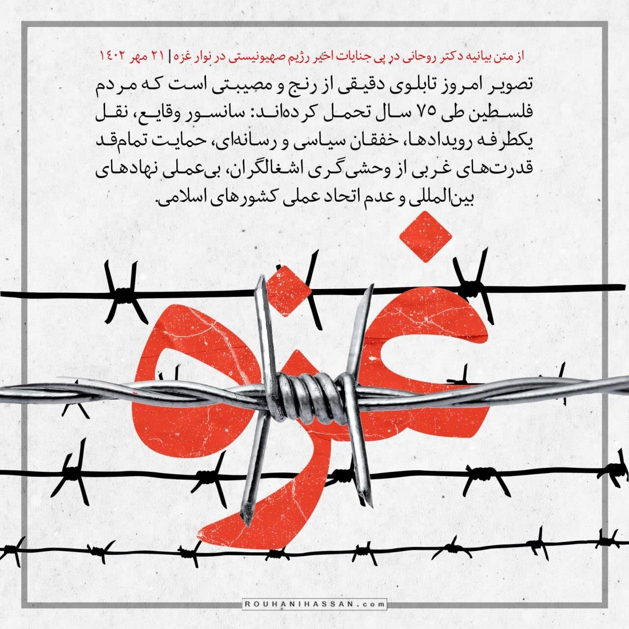 به گزارش خبرگزاری خبرآنلاین، حسن روحانی در بخشی از این بیانیه اعلام کرد: تصویر امروز تابلوی دقیقی از رنج و مصیبتی است که مردم فلسطین طی ۷۵ سال تحمل کردهاند: سانسور وقایع، نقل یکطرفه رویدادها، خفقان سیاسی و رسانهای، حمایت تمامقد قدرتهای غربی از وحشیگری اشغالگران، بیعملی نهادهای بینالمللی و عدم اتحاد عملی کشورهای اسلامی.