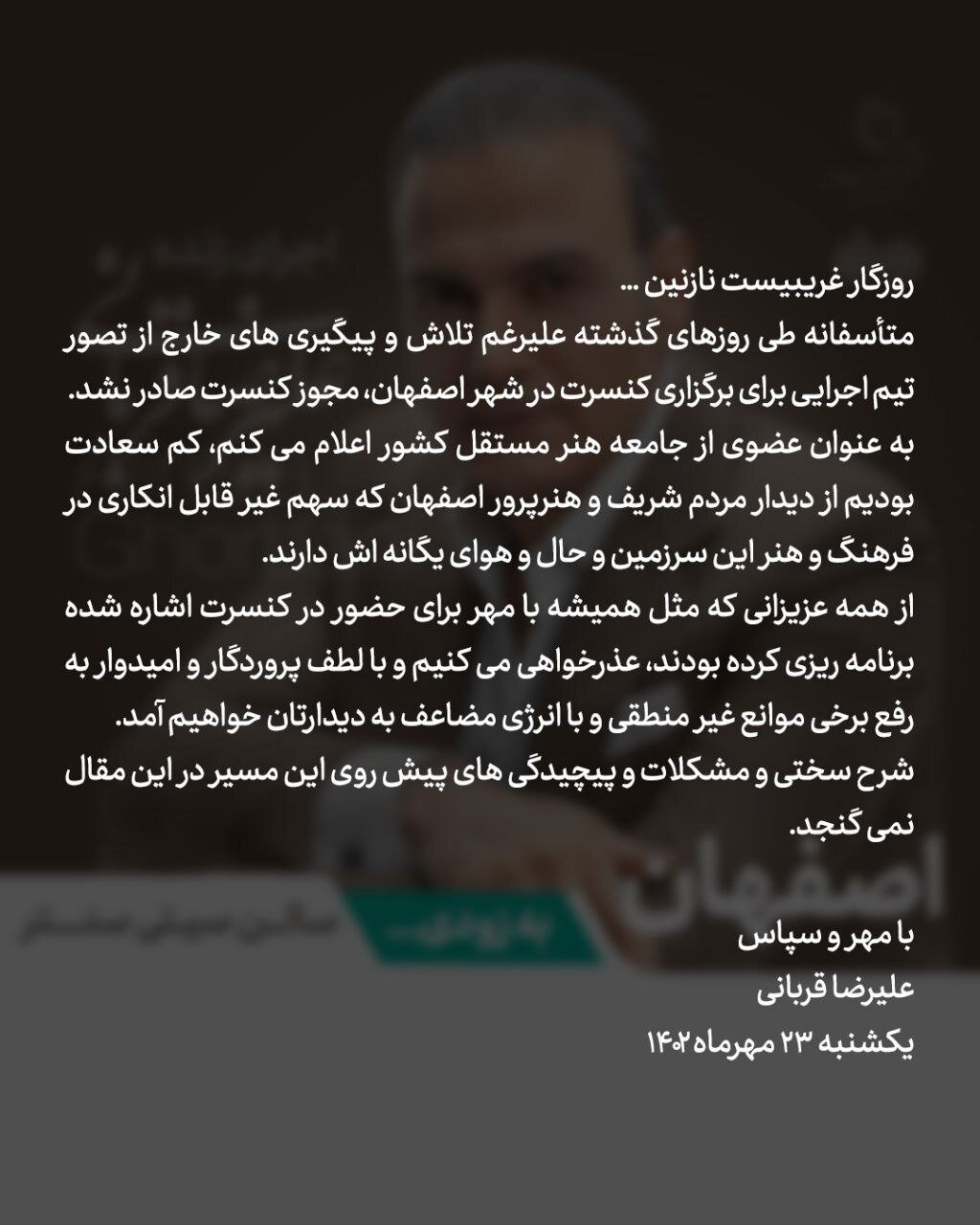 و اما کنسرت شهر اصفهان که برای روزهای ۲۱، ۲۲ و ۲۳ مهرماه برنامهریزی شده بود به دلیل صادر نشدن مجوز، کنسل شد و گروه در تدارک هستند که برنامه جدیدی برای ماههای آتی برنامهریزی کنند که متعاقبا اعلام خواهد شد.
