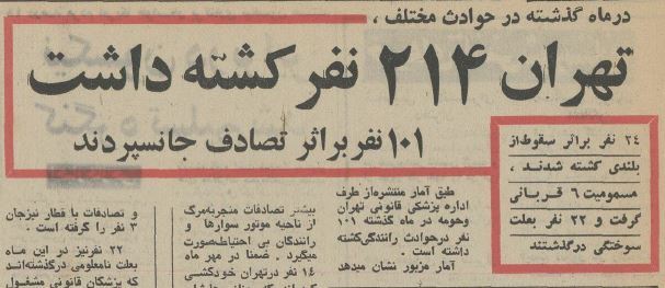 در شهریور نیم قرن پیش ۲۱۴ نفر تهرانی در اثر حوادث جان خود را از دست دادند که ۱۰۱ نفر براثر تصادفات رانندگی دچار حادثه شدند که اغلبشان موتور سوار بودند. خبر را از روزنامه اطلاعات ۲ آبان ۱۳۵۲ بخوانید و عکسی از خیابان بوذرجمهری (۱۵ خرداد) در سال ۱۳۵۲ تماشا کنید.
